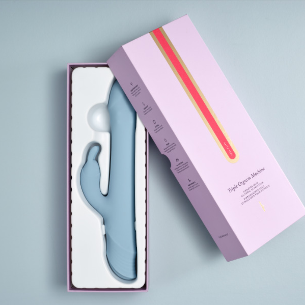 When it comes to powerful, mind-blowing pleasure, more is always more! Discover passion (times three!) with Triple Orgasm Machine, a 3-in-1 vibrator that redefines ecstasy with 3 speeds of thrusting, spinning shaft action and 7 speeds and pulsing patterns of clitoral vibration. As the shaft thrusts, the spinning beads inside tantalize your vaginal walls while the clitoral massager's rabbit ears tease your clitoris with feel-so-good vibrations.